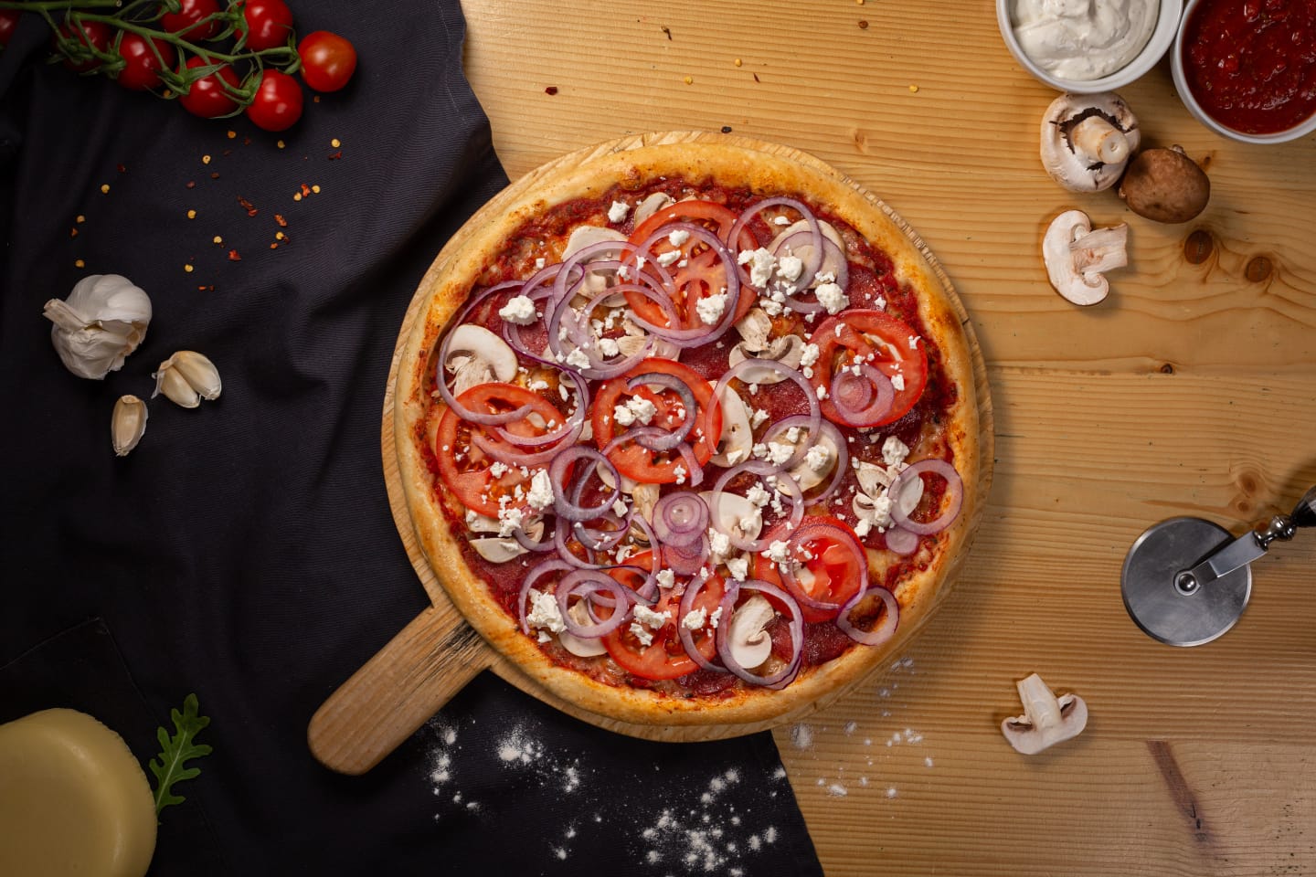 sos rosii, mozzarella, salam, ciuperci, rosii, ceapa, feta